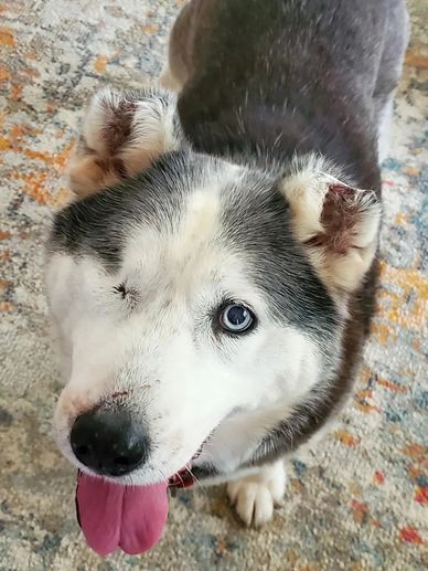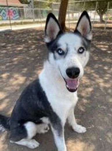 Carnation is a 13 year old siberian husky who we rescued from the Downey Shelter on October 16, 2023. She came to the shelter as a 12 year old stray. She is the sweetest, most people friendly dog. She gives licks and just wants to be with you. Despite her appearance, she is super friendly with people. When she first arrived she was leary of dogs and "greeted" them with a growl and a jump, if given the chance. Since she didn't get along with the other dogs, we had to keep her separate. She had surgery to remove her tumor on her eye and spay her. After her recovery, we started introducing her to all the dogs at the sanctuary. Ends up she is very friendly with them! She still growls if a dog bumps into her blind side, but there is no aggression! She goes on walks every day with other dogs and now she is great with other dogs! Recently Carnation was on SCVTV. here is her 5 minutes of fame! SCVTV