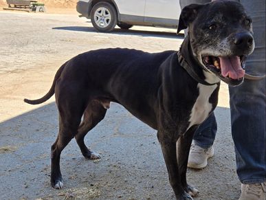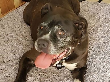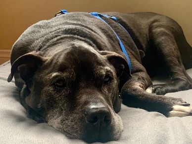 On June 18, 2024, a very friendly, sweet, older black pitbull was brought to the Moreno Valley shelter. The only thing going for him is that he is nice. He has the trifecta of bad traits which no one will want to adopt: old, black, pitbull. And let's not forget the multiple masses on his body and that he is deaf. He is the exact kind of dog we want to save! He was brought to our attention by a networker. They also found us a temporary and permanent foster for this dog. We were so glad all the pieces fit and we could rescue Colin, aka Tony, #A535465 . COlin has been in his foster home for over a year . His foster is just smitten with him and wanted to make his place in her home permanent, so Colin was adopted on September 5, 2025.